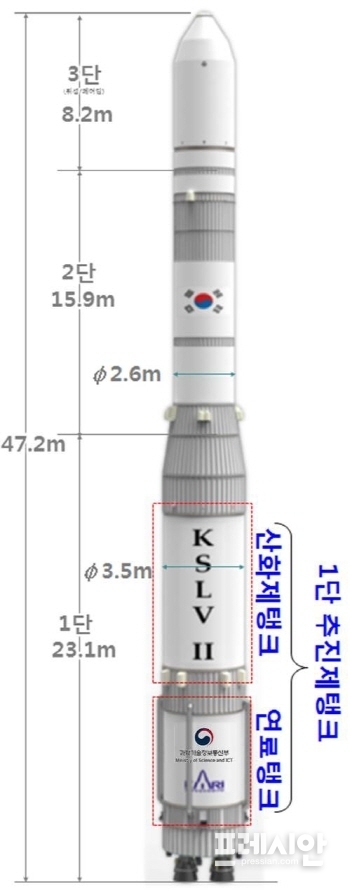 1단 추진제탱크는 지름이 3.5미터로 지난해 발사에 성공한 지름 2.6미터의 시험발사체보다 체적이 커서 공정기술 개발 및 제작이 더욱 까다로웠다는 후문이다.