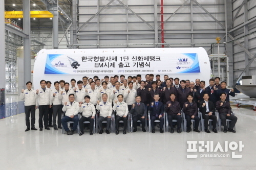 KAI는 지난 25일 종포공장에서 관계자 60여 명이 참석한 가운데‘한국형발사체 1단 산화제탱크 EM 시제품 출고 기념식’을 열고 한국형발사체 사업의 적기 진행과 목표한 개발 성숙도 달성을 기념했다.