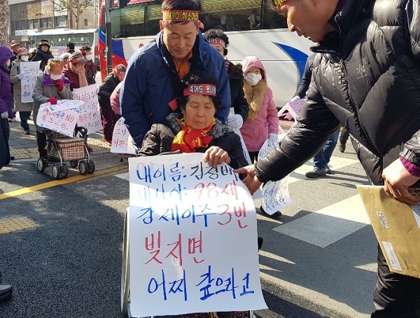 ▲지난 1월28일 충북 청주시 청주에어로폴리스 2지구 개발로 인해 마을을 옮겨가야 하는 내수읍 입동리 주민들이 충북도청 앞에서 이주대책 마련을 촉구하고 있다 ⓒ프레시안(김종혁 기자)