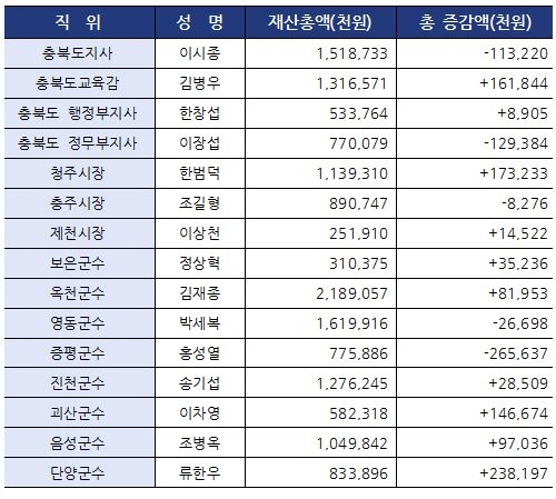 단체장 중 8명이 재산이 늘었으며 한범덕 청주시장과 김재종 옥천군수, 이차영 괴산군수, 류한우 단양군수가 1억 원 이상 재산이 늘어난 것으로 확인됐다.