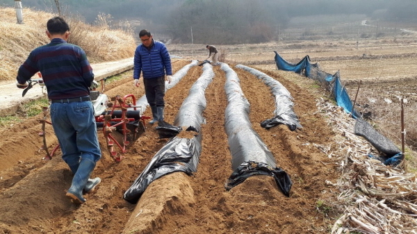 봄철 영농기를 맞아 고추 등 밭작물 두둑, 비닐씌우기 작업을 한창 진행하고 있다.