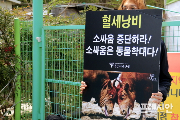 반면, 지난 30일 이곳 소싸움 경기장 입구에는 (사)동물자유연대 강재원 활동가는 “뿔로박고 찌르는 소싸움은 분명 동물 학대 이다”며 1인 시위를 펼치고 있었다.