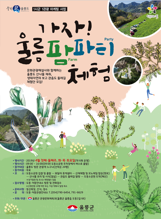 주요 행사내용은 도동소공원 집결을 시작으로 와달리 휴게쉼터에서 죽도를 배경으로 북면의 아름다운 해안가 포토타임 제공, 울릉도 부지갱이 나물 채취 및 산나물무침, 산채비빔밥 시식, 농가 모노레일 탑승, 보물섬 관음도 탐방 순으로 관광객들에게 색다른 경험을 제공할 계획이다.