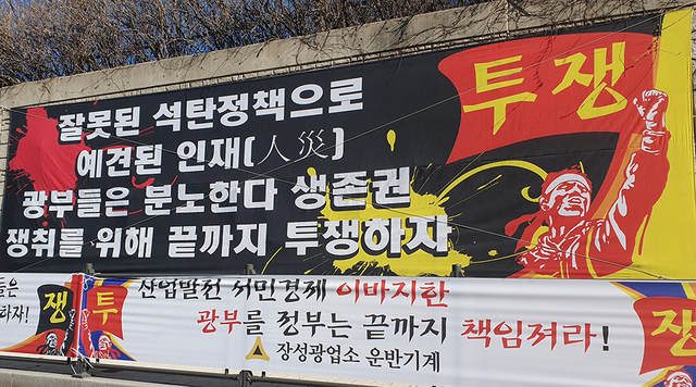 ▲2일 강원 태백시 장성동 대한석탄공사 장성광업소 정문 인근에 지난달 27일 갱내 순직사고에 대한 근본원인이 정부에 있음을 규탄하는 현수막을 부착해 놓고 있다. ⓒ프레시안
