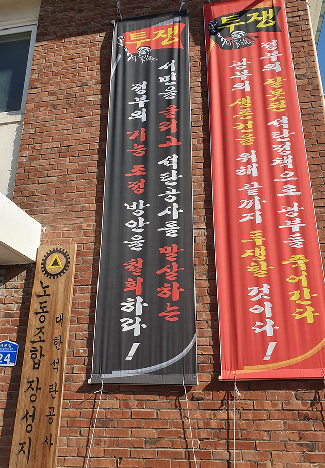 ▲2일 강원 태백시 장성동 대한석탄공사노동조합 장성광업소 지부 사무실 입구에 설치된 현수막에는 정부의 잘못된 기능조정 규탄과 대정부 투쟁을 예고하고 있다. ⓒ프레시안