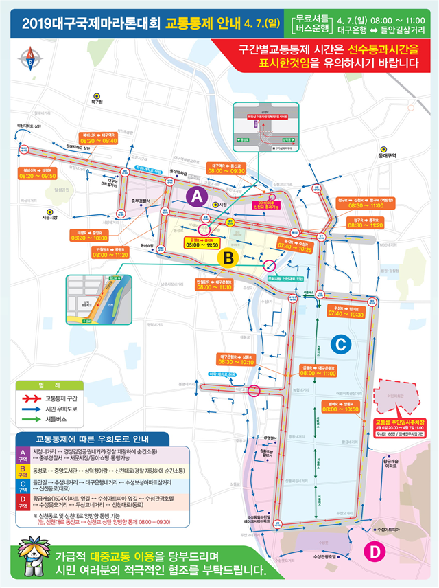 한편, 대구시와 대구지방경찰청은 교통통제에 따른 시민불편을 최소화하기 위해 유기적인 협조체계를 구축하고 준비상황을 점검하고 있으며, 모범운전자도 대회 준비를 위해 대회당일 교통봉사에 참여한다. 중앙네거리에서 종각네거리 구간은 새벽 6시 30분부터 11시 50분까지 교통이 통제되며, 중구 북비산네거리는 8시 20분부터 9시 50분까지, 수성구 대구은행네거리는 7시 40분부터 11시까지 통제되는 등 구간별로 시간차를 두고 차량통행이 통제된다.