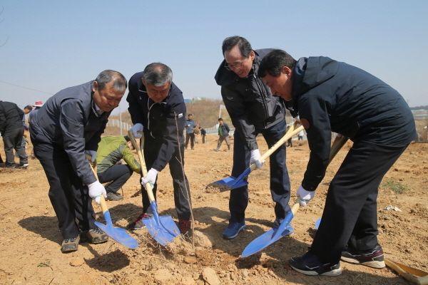 제74회 식목일을 앞두고 4일 오전 농촌진흥청 국립농업과학원에서 열린 나무 심기 행사에서 황규석 농촌진흥청 차장(왼쪽)과 송성환 전라북도의회 의장, 송하진 전라북도지사, 박성일 완주군수가 나무를 심고 있다. 이날 행사에 참석한 관계자들은 국립농업과학원에서 제공한 대지에 아카시나무, 백합나무, 밤나무 총 2,500그루를 심었다.ⓒ농촌진흥청