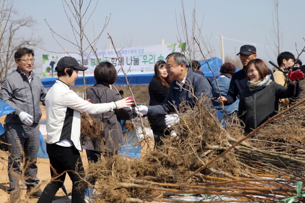 4일 식목일을 앞두고 국립농업과학원에서 열린 나무 심기 행사에서 황규석 농촌진흥청 차장이 참가자에게 나무를 나눠주고 있다.ⓒ농촌진흥청