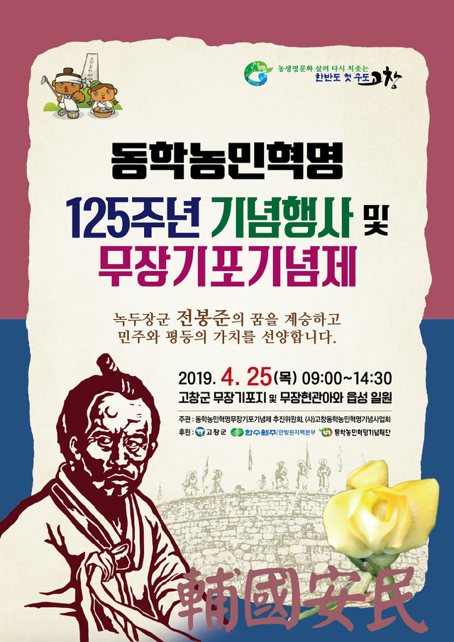 4일 고창군에 따르면 동학농민혁명 무장기포를 기념하기 위해 오는 25일 공음면 무장기포지 일원에서 ‘동학농민혁명 125주년 기념행사와 무장기포기념제’를 연다.