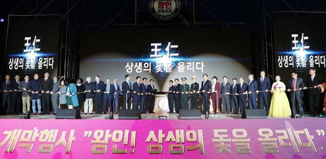 2019 영암왕인문화축제 개막식이 지난 4일 오후 영암군 군서면 왕인박사유적지에서 열린 가운데 김영록 전라남도지사, 전동평 영암군수, 장석웅 전남교육감, 서삼석 국회의원, 쑨시엔위 주 광주중국총영사, 주한외교대사 등 참석자들이 왕인호 상생의 돛줄을 당기는 퍼포먼스를 하고 있다.