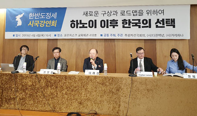 4일 서울 정동 프란체스코 회관에서 주권자 전국회의, 겨레하나, 다른백년은 '새로운 구상과 로드맵을 위하여'를 주제로 시국강연회를 가졌다. 이날 강연을 진행한 강태호 전 한겨레 평화연구소장은 "북핵 문제는 북미 간 적대관계의 해소를 통해 해결될 수밖에 없지만, 미국이 트럼프 행정부의 합의를 이행할 수 있을 것이냐는 관점에서 본다면 북미 간 합의는 매우 불안정하고 위태로운 것"이라고 평가했다.
