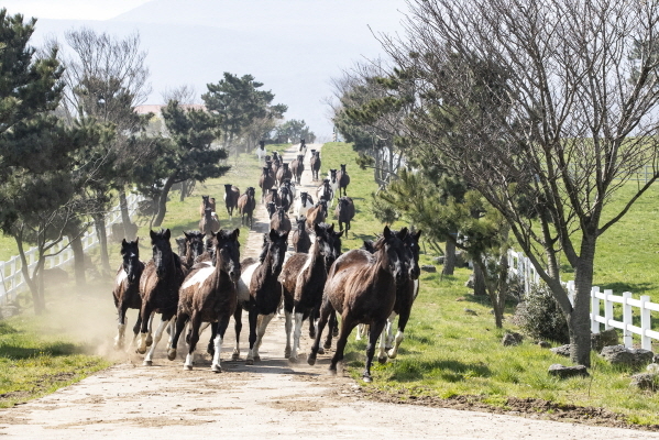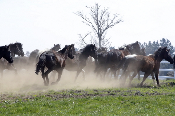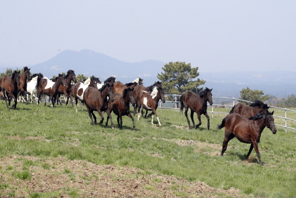 지난 5일 오전 한국형 승용마 방목 공개 행사가 열린 농촌진흥청 국립축산과학원 난지축산연구소(제주시 오등동)의 초지에 방목된 한라마 개량종들이 무리지어 힘차게 달리고 있다.