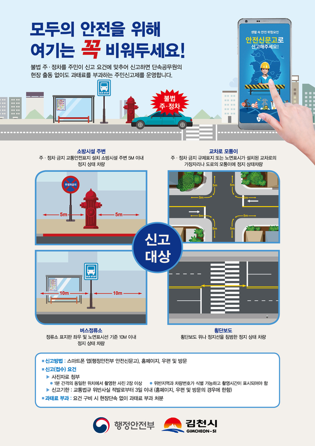 주민신고제는 시민 누구나 스마트폰 앱(행정안전부 안전신문고)을 통해 4개 불법주정차 행위(소방시설, 교차로, 버스승강장, 횡단보도)를 시민들의 신고만으로 과태료를 부과하는 제도이다.