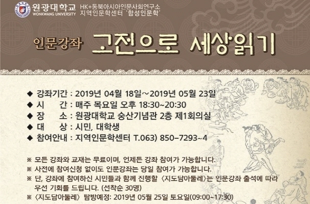 이번 고전으로 세상읽기 강좌는 누구나 참여 가능하며, 자세한 사항은 원광대 지역인문학센터로 문의하면 된다.