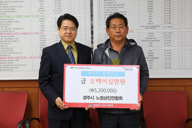 15일 경주시장학회에 따르면 경주시 노점상인연합회는 지난 12일 경주시청를 방문, 이영석 부시장에게 장학금을 전했다는 것.