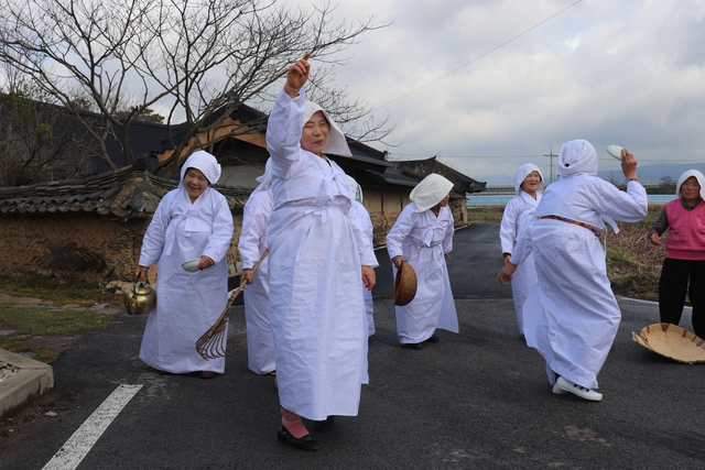 지난 14일 고창군 도산마을 경로당 앞. 흰색 두레 복장을 걸쳐 입고 두건을 쓴 아낙네들이 덩실덩실 춤을 추기 시작한다.