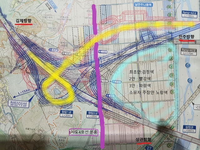 A씨는 "현재 나온 마지막 안은 곡선 반경이 작아 논 진입로가 접해 있는 본선과 나들목 사이 시도 4호선의 길이가 120여m밖에 안된다. 이를 250m 이상 확보해 주면 우리는 대안으로 받아들일 수 있다"라며 "소유자 1인당 3억원이 넘는 피해를 보는데 보상은 못해 줄 망정 피해 최소화를 위해 대책을 수립해 줘야 하는게 아니냐"고 하소연했다.