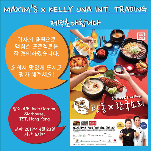 이번 ‘맥심스 광동+한국요리 페스티벌’에는 ㈜참숯에서 지난달 수입한 훈제오일로 튀긴 치킨과 훈제소금으로 요리한 수육, 삼계탕, 광동요리 등이 홍콩인들의 입맛을 사로잡을 예정이다.