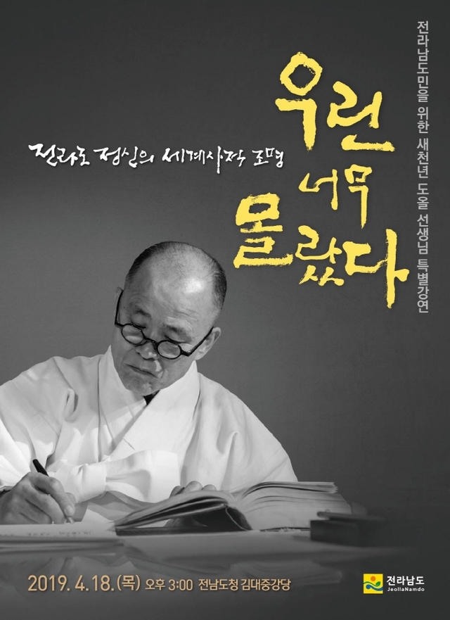 한편 고동석 전라남도 행정지원과장은 “사회에 역사적·철학적 화두를 던져온 도올 김용옥 선생의 시각으로 전라도 혼과 정신을 재조명함으로써, 숨겨지고 왜곡된 역사를 바로 잡고 전라도의 자존감과 위상을 되찾기 위해 강연을 마련했다. 전라도 천년의 역사를 되돌아보며 새로운 천년의 비전을 생각해보는 뜻깊은 시간이 될 것이다"고 말했다.