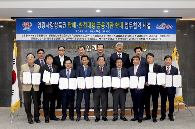 영광군(군수 김준성)은 지난 18일 군청 회의실에서 15개 금융기관장들과 영광사랑상품권 판매대행 업무협약을 체결했다.