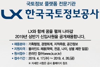 LX는 기획경영직 9명, 국토정보직 254명, 보조직 10명, 무기 계약직 23명 등 모두 296명의 신입사원을 선발한다고 19일 밝혔다.