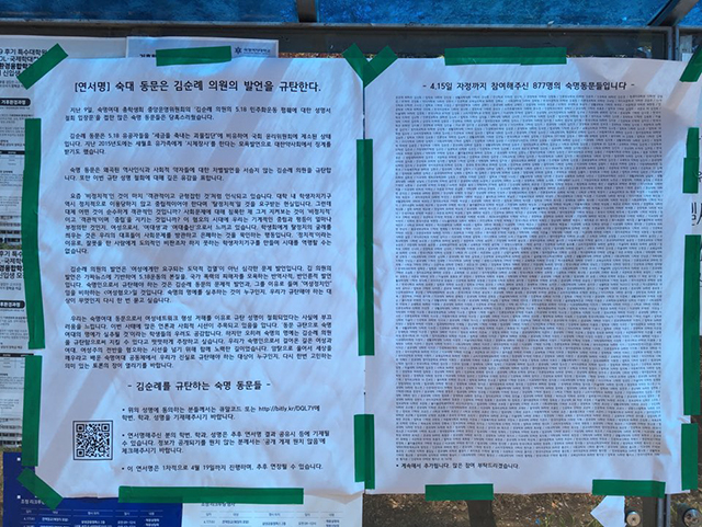 이에 숙대 동문들은 '깊은 유감'을 표하며 연서명에 나섰다. 동문들은 '여성 정치인 규탄이 여성혐오적'이라는 주장에 대해 "김 의원의 발언은 '여성에게만 요구되는 도덕적 검열'이 아니라 심각한 문제 발언"이라며 "가짜뉴스에 기반해 5.18 운동의 본질과 국가 폭력의 피해자를 모욕하는 반역사적·반인륜적 발언"이라고 했다.