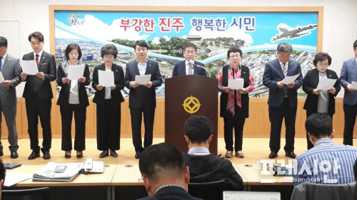 경남 진주시의회 박성도 의장을 비롯한 의원 일동은 22일 시청 브리핑룸에서 기자회견을 열고 “철탑에 농성중인 노조원 2명이 시의회에 ‘진주시 시내버스 특별위원회’를 구성하면 고공농성 해제를 약속을 했지만 미이행하고 있다”며 약속이행을 촉구했다.
