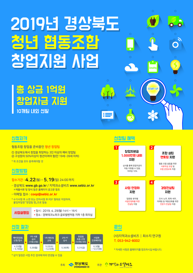 한편 도는 오는 29일 오후2시 경북테크노파크 글로벌벤처동 지하1층 회의실에서 협동조합 창업을 희망하는 청년을 대상으로 신청절차 및 추진일정을 안내하고 서류 작성방법, 사례 학습 등을 위한 사업설명회를 연다.