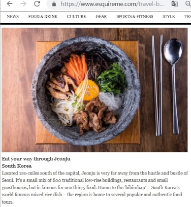 전 세계 발행부스 80만부에 이르는 남성매거진인 ‘에스콰이어’는 지난 7일 자사 중동판 온라인을 통해 공개한 ‘여행 버킷 리스트 아이디어: 죽기 전에 꼭 해봐야할 100가지(Travel Bucket List Ideas: 100 things to do before you die)’에 △에콰도르 갈라파고스 섬 항해 △뉴질랜드에서의 번지점프 △스위스 알프스의 헬리콥터 스키 △미국의 절경 로드트립 △사하라사막의 모래서핑 등과 함께 전주 미식여행을 소개했다.