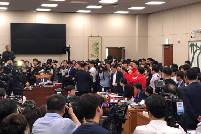 한국당 의원들이 뒤늦게 10시 30분경 회의장 앞에 도착해 문을 열어달라고 요구했고, 45분께 문이 열리고 취재진과 야당 의원들이 입장한 후 10시 50분께 회의가 시작됐다.