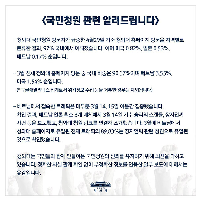 청와대는 "4월 29일 기준 청와대 홈페이지 방문을 지역별로 분류한 결과, 97% 국내에서 이뤄졌다. 미국이 0.82%, 일본 0.53%, 베트남 0.17% 순이다"라고 밝혔다.