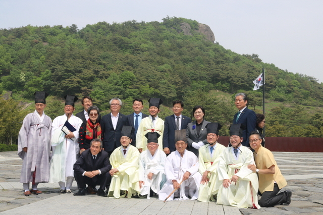 ▲헌다례를 마치고 기념촬영을 하고있다. (뒤에 사자바위가 보인다).ⓒ프레시안(조민규).
