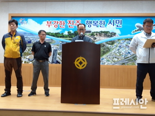 ▲2일 우리노동조합은 진주시청 브리핑룸에서 삼성교통 정상화를 위해 류재수 의원을 고발하고 삼성교통 모든 의혹에 대해 즉각 감사하라고 밝히고 있다.ⓒ프레시안 김동수