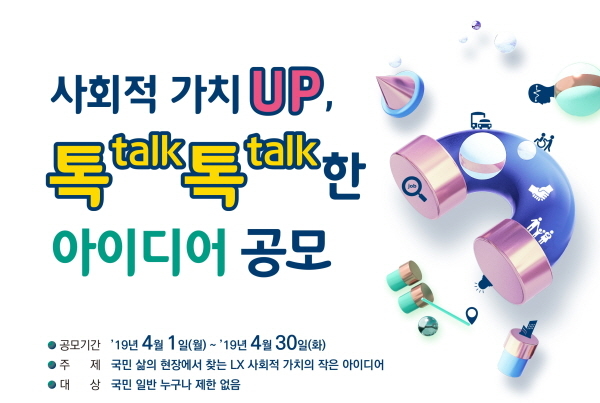 LX 는 오는 7일부터 23일까지 '사회적 가치 UP, 톡 (talk)톡(talk)한 아이디어 공모전'에 제출된 73개의 아이디어를 대상으로 '국민 투표'를 실시한다고 3일 밝혔다.