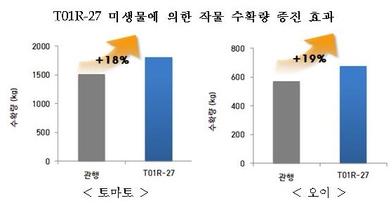 염류 농도가 높은 시설재배지를 대상으로 미생물 배양 희석액을 정식 후 2주 간격으로 처리하는 농가실증 시험을 수행한 결과, 기존 재배방법에 비해 토마토 수확량은 18%, 오이는 19% 증가했다.