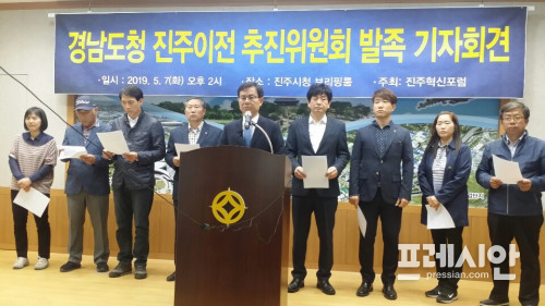 진주혁신포럼(대표 갈상돈)은 '경남도청 진주이전 추진위원회'를 발족하고 7일 진주시청에서 기자회견을 열어 앞으로 계획을 밝혔다.