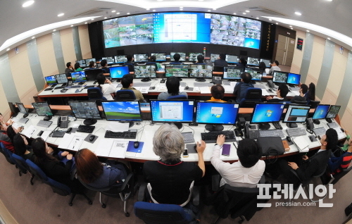 ▲진주시 도시관제센터에 운영 중인 2300여대의 CCTV 모니터링을 강화하고 있다.ⓒ진주시