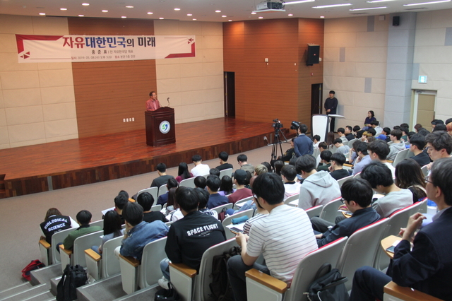 홍준표 전 자유한국당 대표가 8일 ‘자유 대한민국의 미래’라는 주제로 상지대 본관5층 대강당에서 특강을 했다.