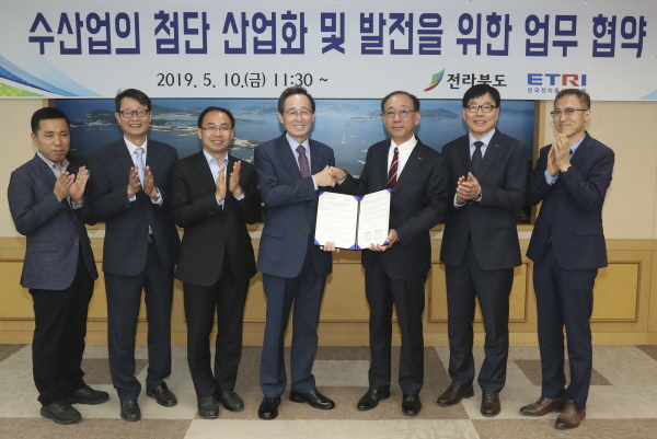 전라북도와 한국전자통신연구원(ETRI)은 10일, 전북도청에서 송하진 도지사와 김명준 원장이 참석한 가운데 전라북도 수산업의 첨단 산업화와 미래형 산업 육성을 위한 업무 협약을 체결했다.