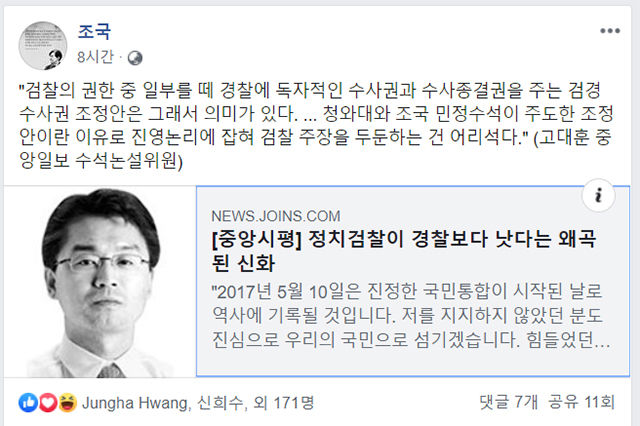 조 수석은 10일 자신의 페이스북을 통해 '정치검찰이 경찰보다 낫다는 왜곡신화'라는 제목의 한 일간지 칼럼을 게재했다.