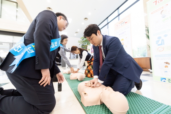 오는 23일까지 매주 화요일과 목요일 본점 1층 로비에서 운영되며, 임직원은 물론 고객들을 대상으로 심폐소생술을 시연하고 참여자 모두가 한번 씩 실습할 수 있도록 심폐소생술 마네킹 5 Set를 준비했다.