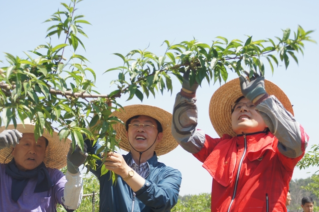 ▲황교안 대표와 이만희 의원이 주민들과 함께 영천시 대창면 용대로 소재 복숭아밭에서 적과작업(솎아주기)을 하고 있다. ⓒ이만희 의원