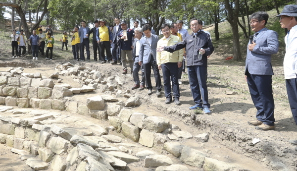 송 지사는 먼저 침령산성 발굴조사 현장에서 군산대 가야문화연구소 곽장근 소장으로부터 발굴조사 추진현황에 대한 설명을 듣고 발굴조사단과 관계자들의 노고를 격려한 후 발굴조사 현장을 둘러봤다.