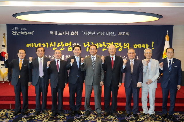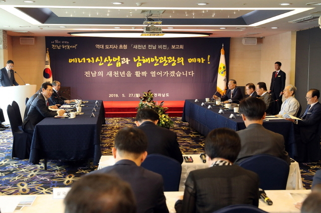 전라남도는 27일 목포 샹그리아호텔에서 김영록 도지사와 간부 공무원이 모두 참석한 가운데 역대 도지사를 초청, ‘새 천년 전남 비전’ 보고회를 열어 전남의 미래 신 성장 전략을 논의했다.