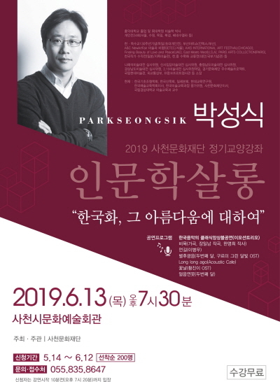 사천문화재단에서 주최‧주관하는 ‘2019 인문학살롱’ 두 번째 강연이 6월 13일 오후 7시 30분부터 사천시문화예술회관에서 강연자 박성식 교수(경상대학교 미술교육과)를 모시고 ‘한국화, 그 아름다움에 대하여’란 주제로 진행된다.