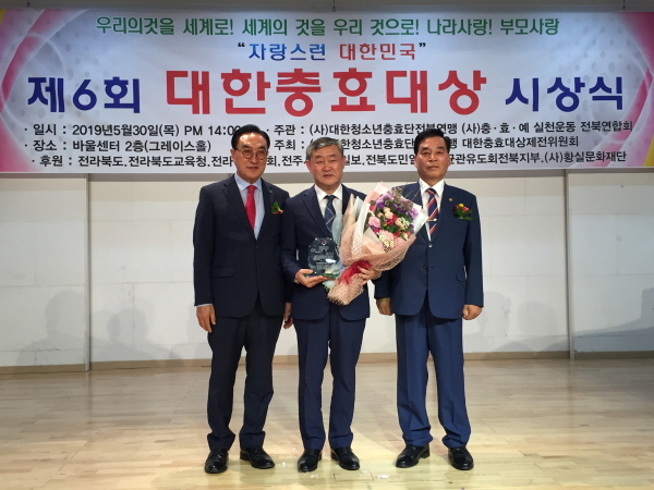 전라북도의회 송성환 의장이 30일, 전주바울센터 2층에서 열린 ‘제6회 자랑스런 대한민국 충효대상 시상식’에서 의회부문 금상을 수상했다.