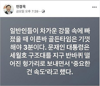 민경욱 자유한국당 대변인이 헝가리 유람선 사고와 관련 "골든타임은 3분"이라는 글을 SNS에 게재해 여론의 뭇매를 맞고 있다.