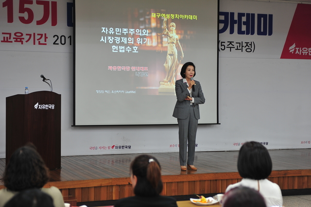 수료식에 앞서 나경원 원내대표는 ‘자유민주주의와 시장경제의 위기, 헌법수호’란 주제의 특강에서 “내년 총선이 관권선거, 금권선거, 북풍선거가 예상된다”며 “자라는 자녀와 대한민국의 미래를 지키기 위해 여성의 리더십, 어머니의 리더십으로 민풍의 중심인 태풍의 눈이 되어 이 정권은 안 된다고 민풍으로 막아 달라”고 주문했다.