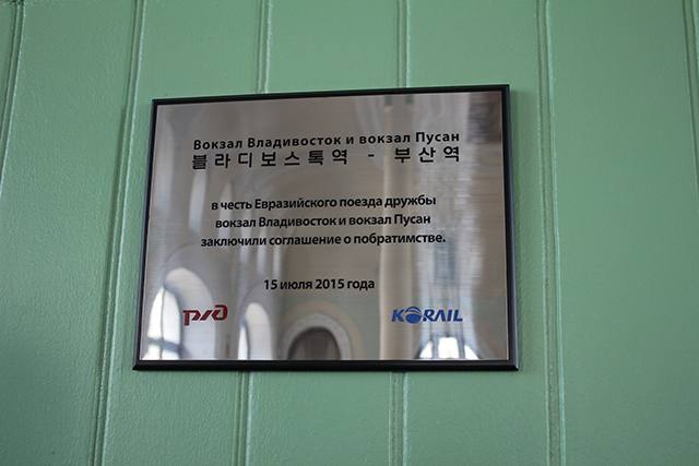 둘러보다 보니, 낡은 벽에 걸린 두 개의 동판이 눈에 띄었다. 하나는 제정러시아의 마지막 황제이자 시베리아 횡단철도 착공식에 참석한 황제 니콜라이 2세의 방문을 기념하는 동판, 또 하나는 2015년 부산역과 자매결연을 기념해 만든 동판이었다. 박 기관사는 "부산에서부터 열차를 타고 블라디보스토크역까지 올 그날을 고대한다"고 했다.