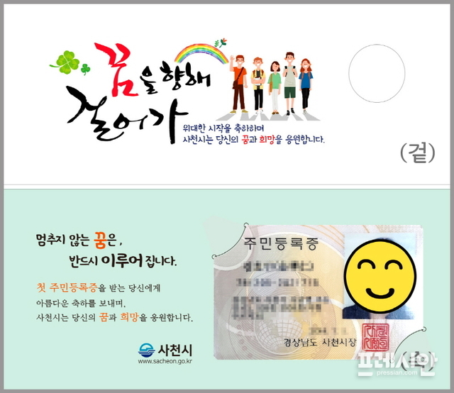 경남 사천시는 민원인에게 소소하지만 큰 감동을 주는 행정 서비스를 구현하기 위해 ‘생애 첫 주민등록증 발급 축하 카드’를 제작해 배부한다고 10일 밝혔다.